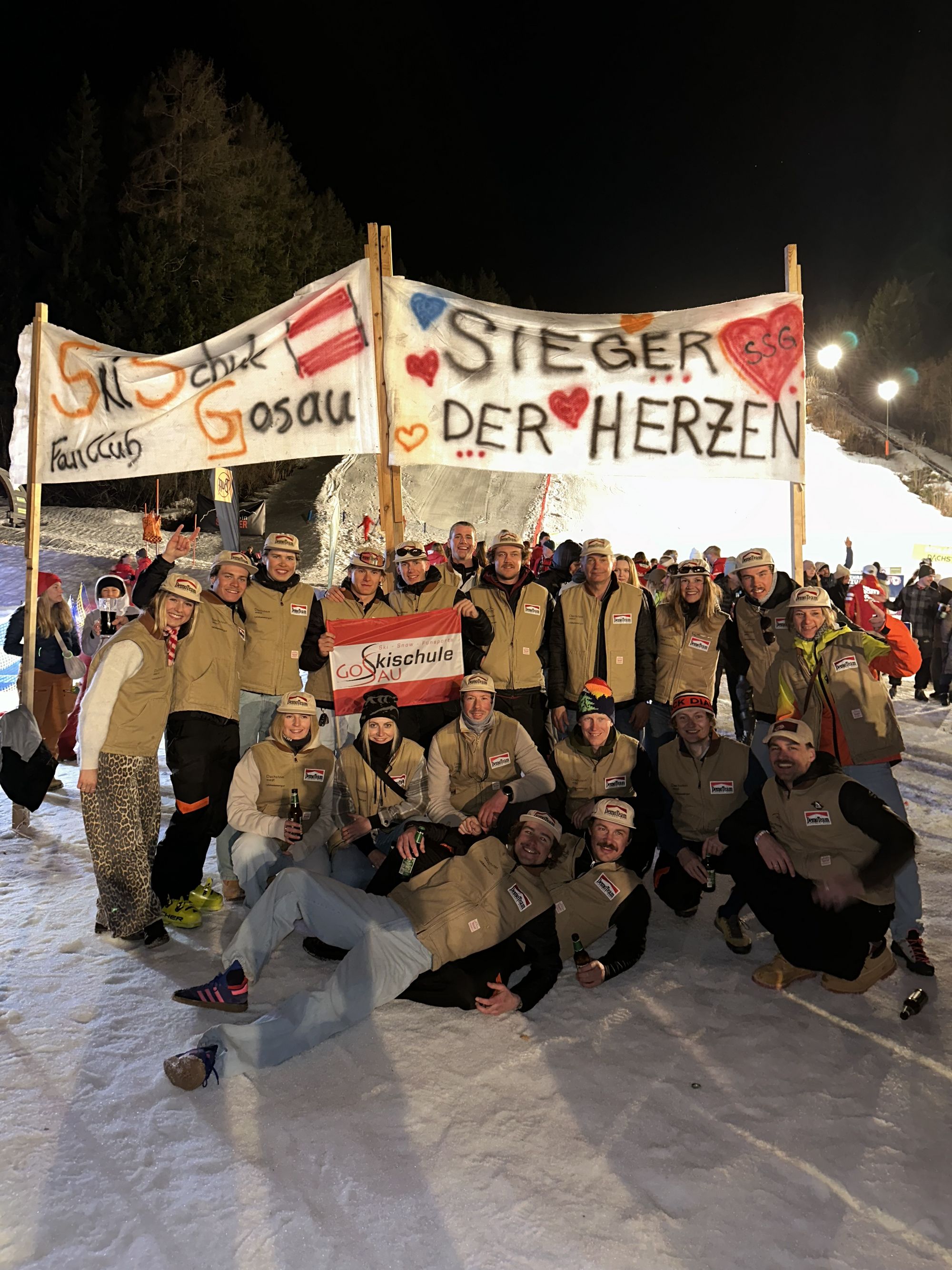 In mid-March, the Austrian Demo Championships took place in Ramsau am Dachstein. The Gosau Ski School was the only Austrian ski school to be represented by three teams, and all three made it through to the final of the top 10. In total, around 40 teams from ski schools across Austria took part. Our teams – and, above all, our large fan club – represented the Dachstein West ski region with distinction.